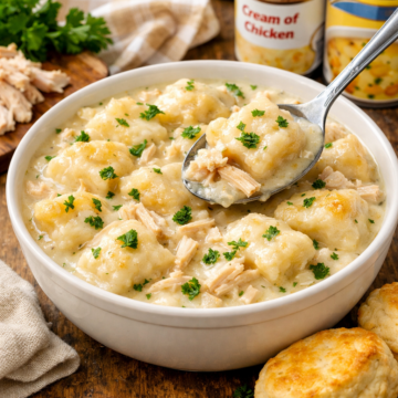 Tender shredded chicken simmers in a creamy, savory broth, while fluffy biscuit dumplings cook right on top, soaking up all that rich flavor.