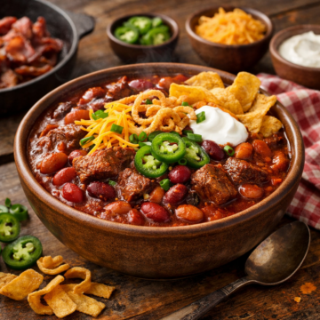 Cowboy Chili is the kind of hearty, slow-simmered meal that feels tailor-made for cold nights, game days, and feeding a hungry crowd. Instead of ground meat, this version uses chunks of tender chuck roast, giving the chili a rich, beefy texture that stands up to bold spices and smoky bacon. Fire-roasted tomatoes and beef broth form a deep, savory base that develops even more flavor as it simmers.